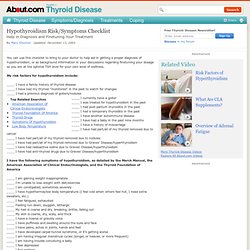 THYROID SYMPTOMS CHECKLIST (from Mary Shomon’s website on thyroid disorders) My risk factors for hypothyroidism include: ____ I have a family history of thyroid disease ____ I have had my thyroid "monitored" in the past to watch for changes ... Fetch Content